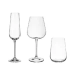 Contém: 06 taças champanhe 210ml, 06 taças água/vinho 560ml, 06 copos cerveja 380ml e 06 copos whisky 350ml